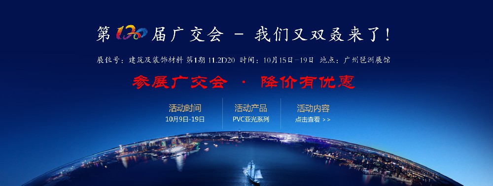 為了傾情回饋國內(nèi)外新老客戶,公司臨時(shí)決定,在廣交會(huì)展前及展中期間對PVC瑪瑙膜,PVC冰花膜等PVC亞光系列產(chǎn)品進(jìn)行降價(jià)促銷活動(dòng),活動(dòng)期間訂購均可享受以下價(jià)格優(yōu)惠:
